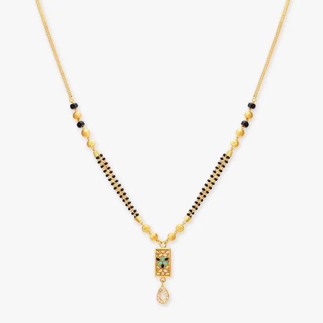 Celebrate marital grace with this 22 Karat yellow gold Mangalsutra, featuring black beads, an ornate Pendant with blue enamel, and cubic zirconia.